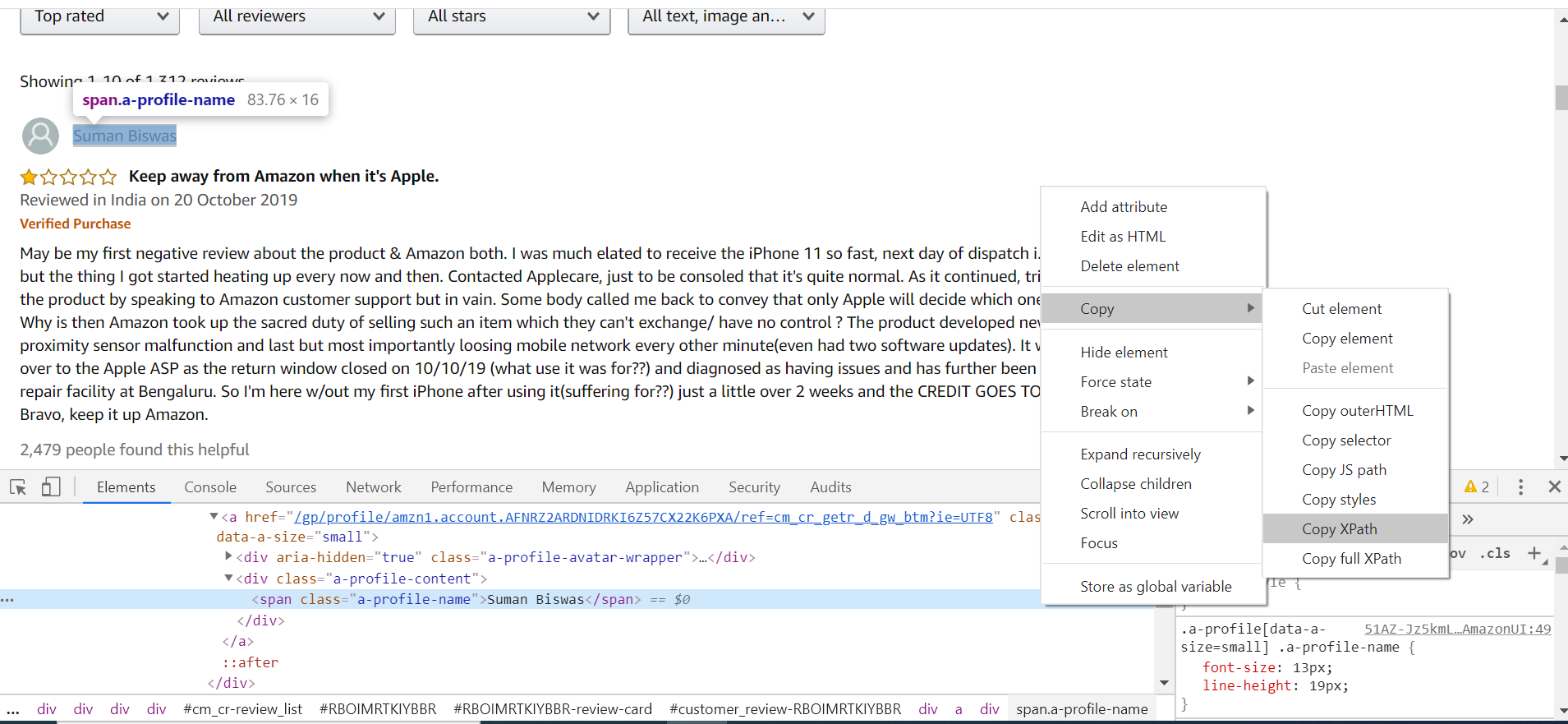 There is an interesting thing to note here that the XML path contains a review id, which uniquely denotes each review on the website. This will be very helpful as we try to recursively scrape multiple comments.