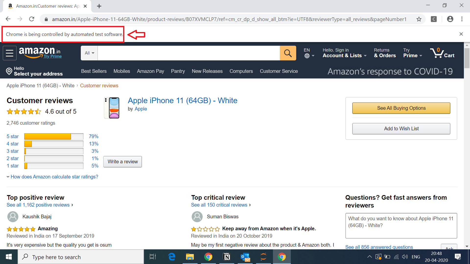 The first and foremost thing while scraping a website is to understand the structure of the website. We will be scraping the reviews for Apple iPhone 11 64GB on Amazon.in website. We will scrape 1000 reviews from different users across multiple pages. We will scrape user name, date of review and review and export it into a .csv file for any further analysis.