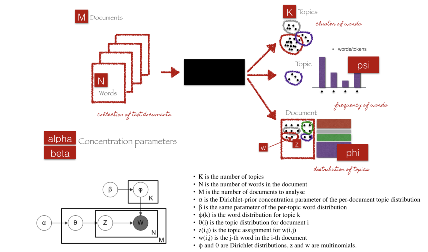 Illustration of LDA input/output workflow (Credit: http://chdoig.github.io/pytexas2015-topic-modeling/#/3/4)